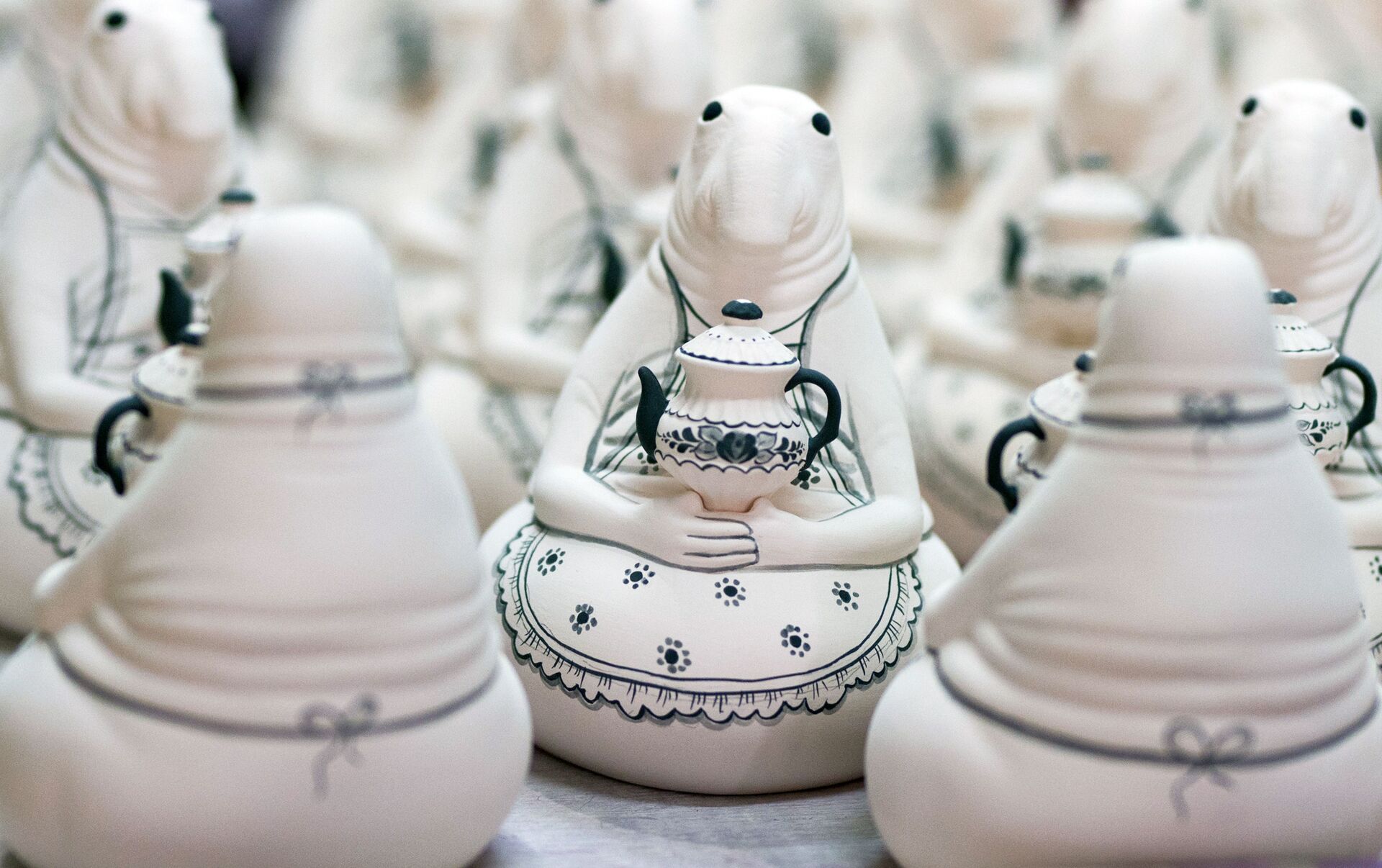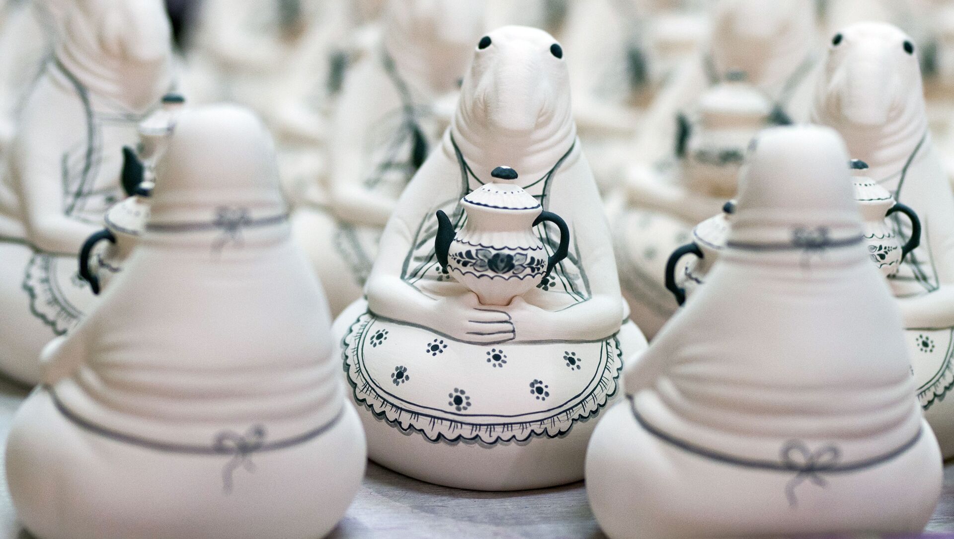 Расписанные изделия интернет-мема Ждуна перед глазурованием в цехе Гжельского фарфорового завода "Объединение Гжель".