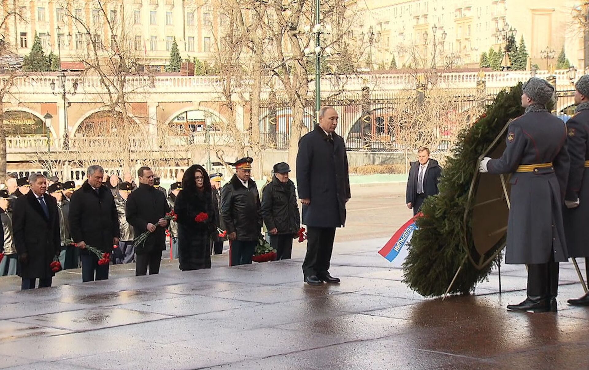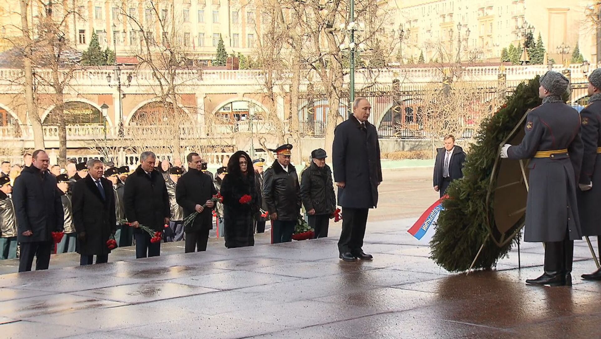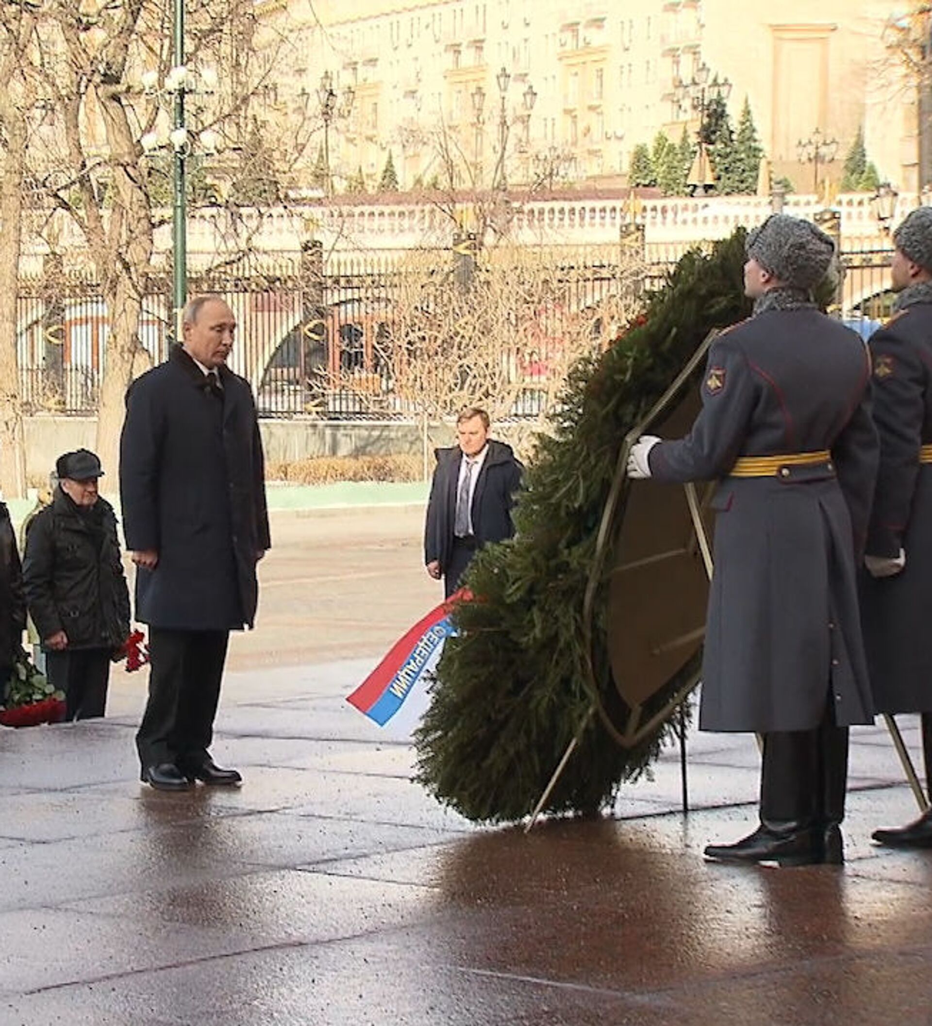 Венок был украшен с лентой в цветах российского флага и надписью "Неизвестному солдату от президента Российской Федерации".