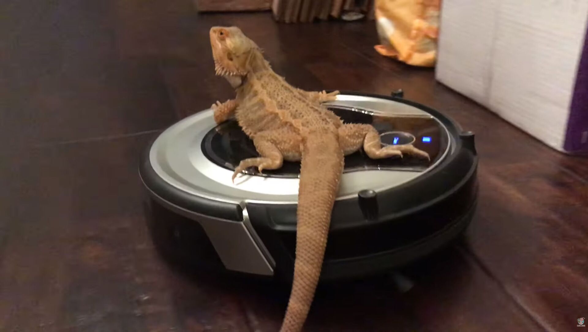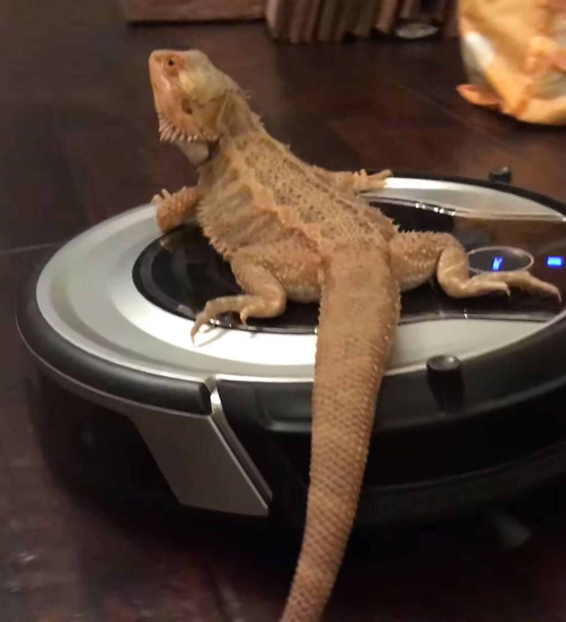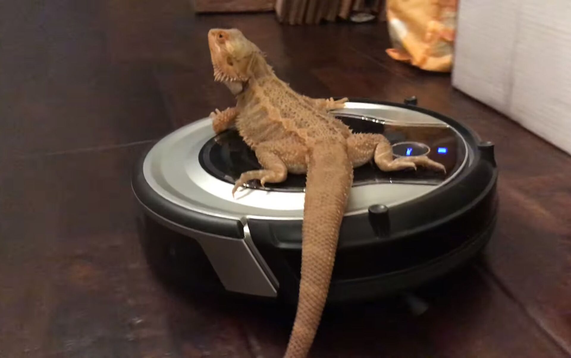 Ящерица оказалась ничуть не встревожена, попав в такую непривычную для себя ситуацию. Она раскатывает на пылесосе, как на гоночном автомобиле, вызывая восторг зрителей.