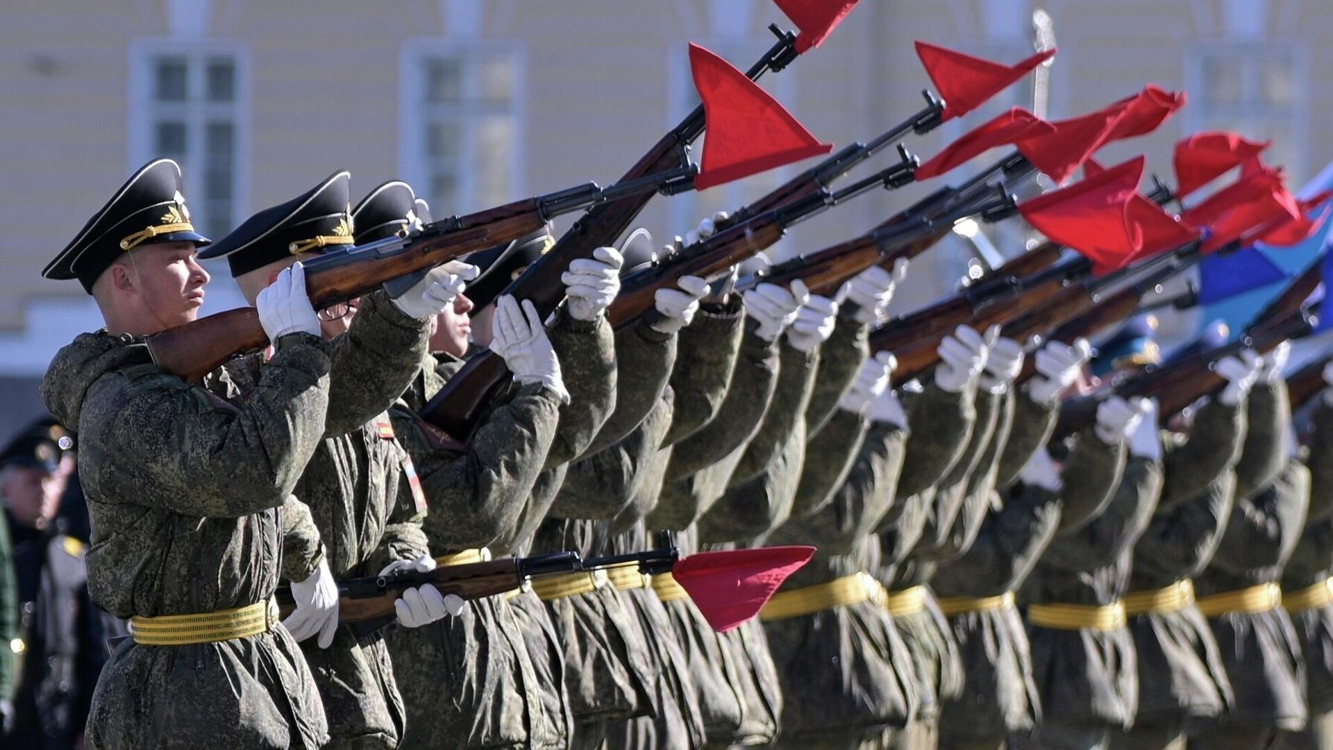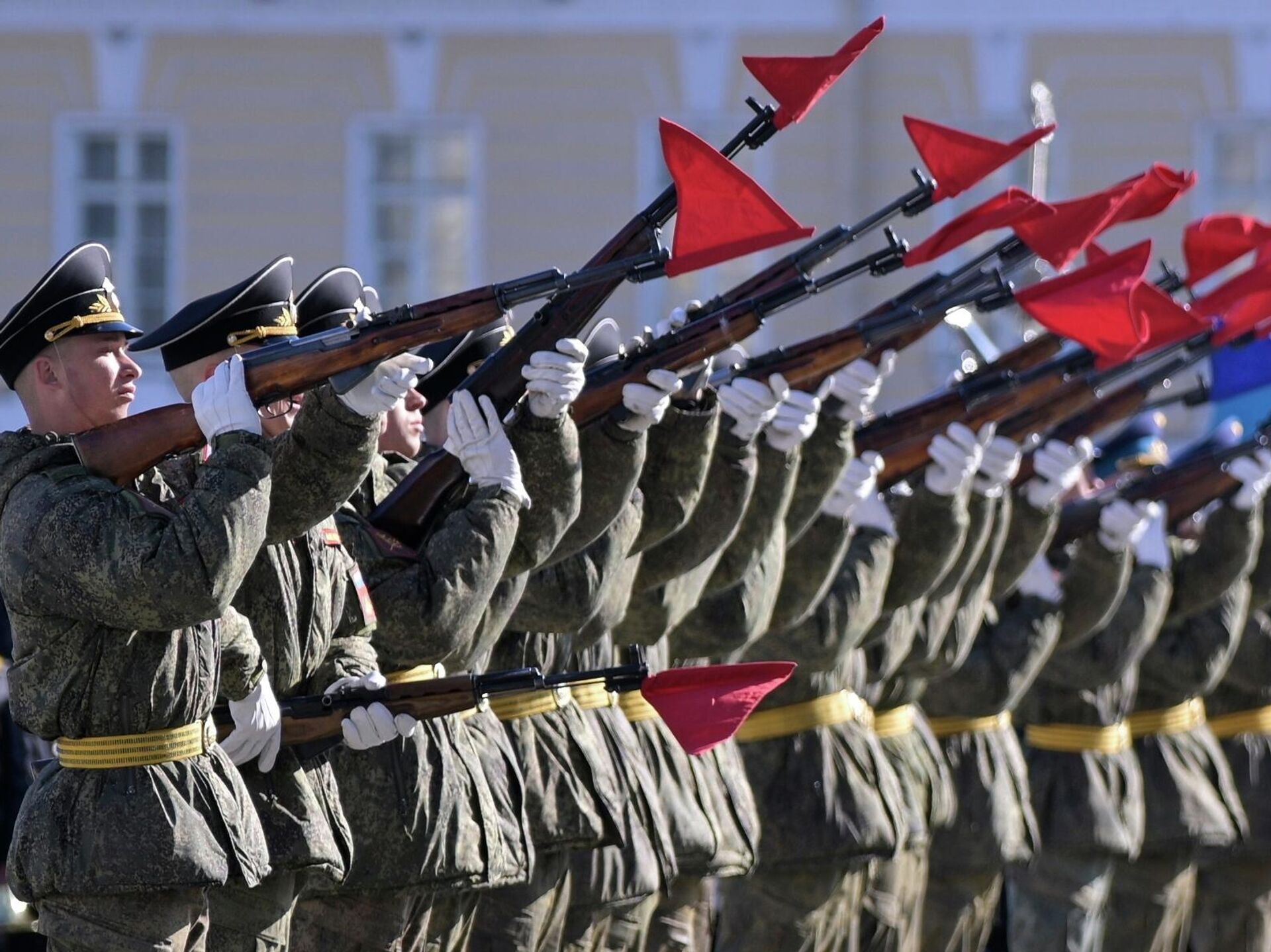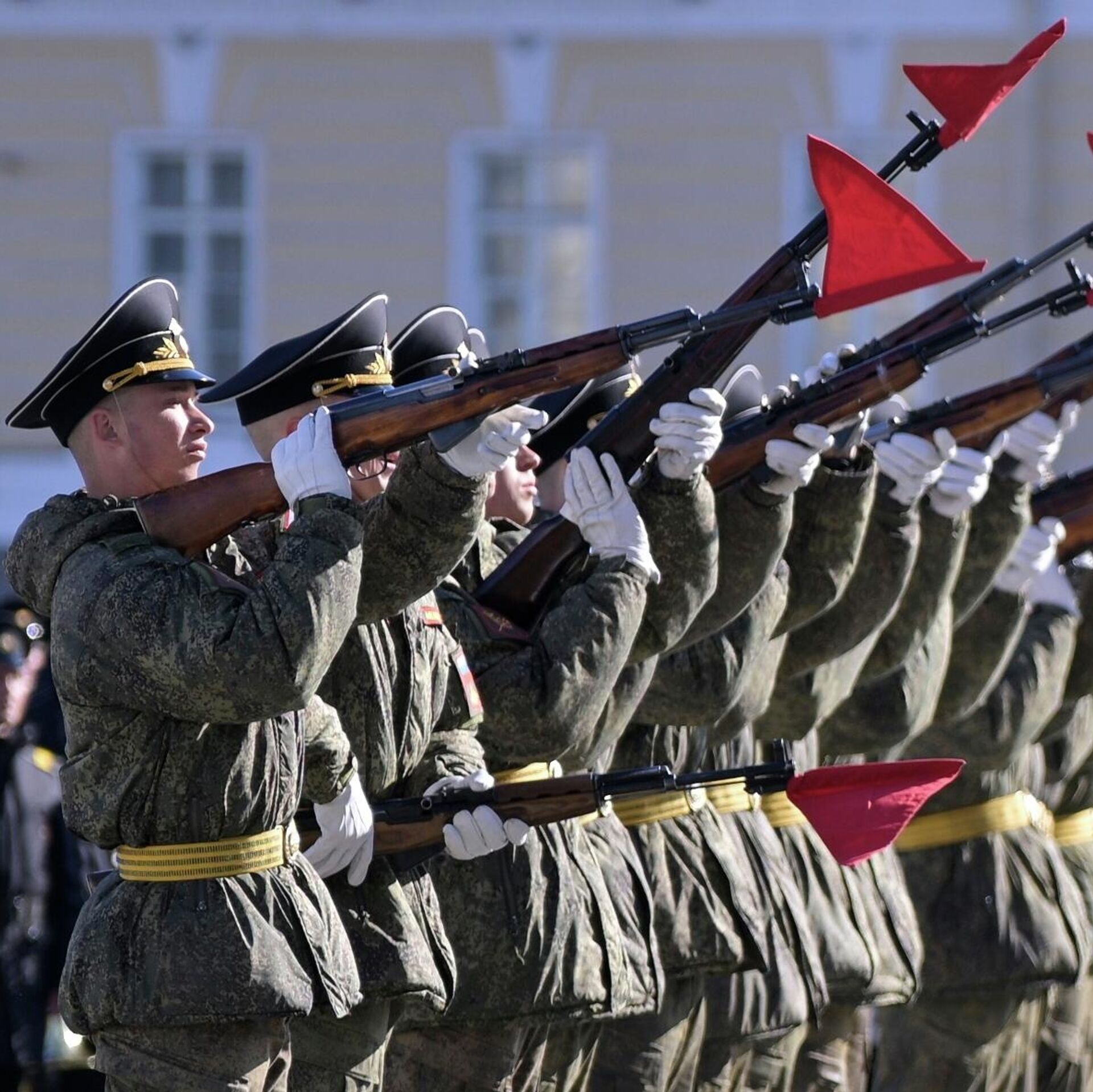 Солдат на репетиции военного парада на Дворцовой площади в Санкт-Петербурге.